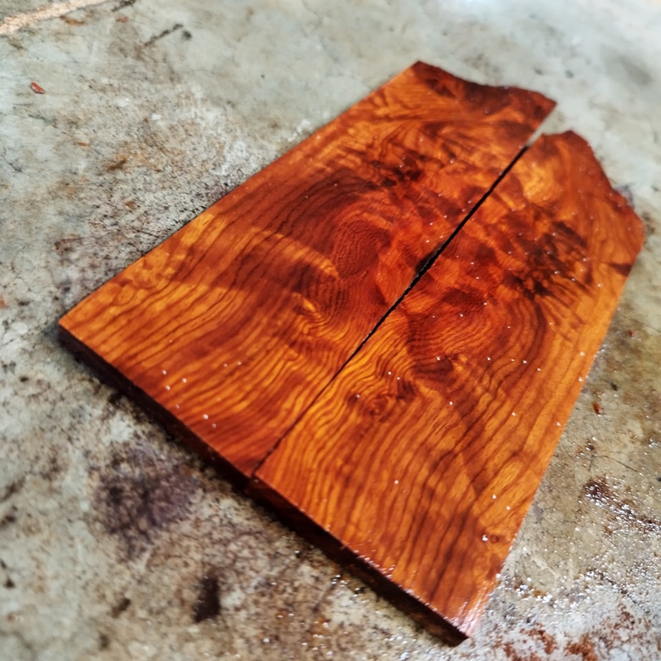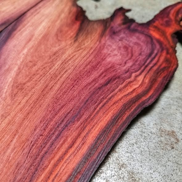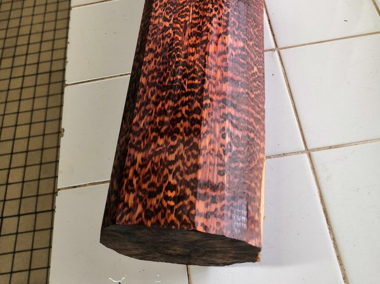 Le cocobolo est un bois précieux originaire d’Amérique centrale. Faisant partie de la famille du bois de rose, il est réputé pour ses couleurs flamboyantes allant du rouge-orangé au rouge profond, souvent traversées par des veines noires et violettes. Le cocobolo est un bois très dense, lourd et naturellement huileux, ce qui le rend résistant à la pourriture.