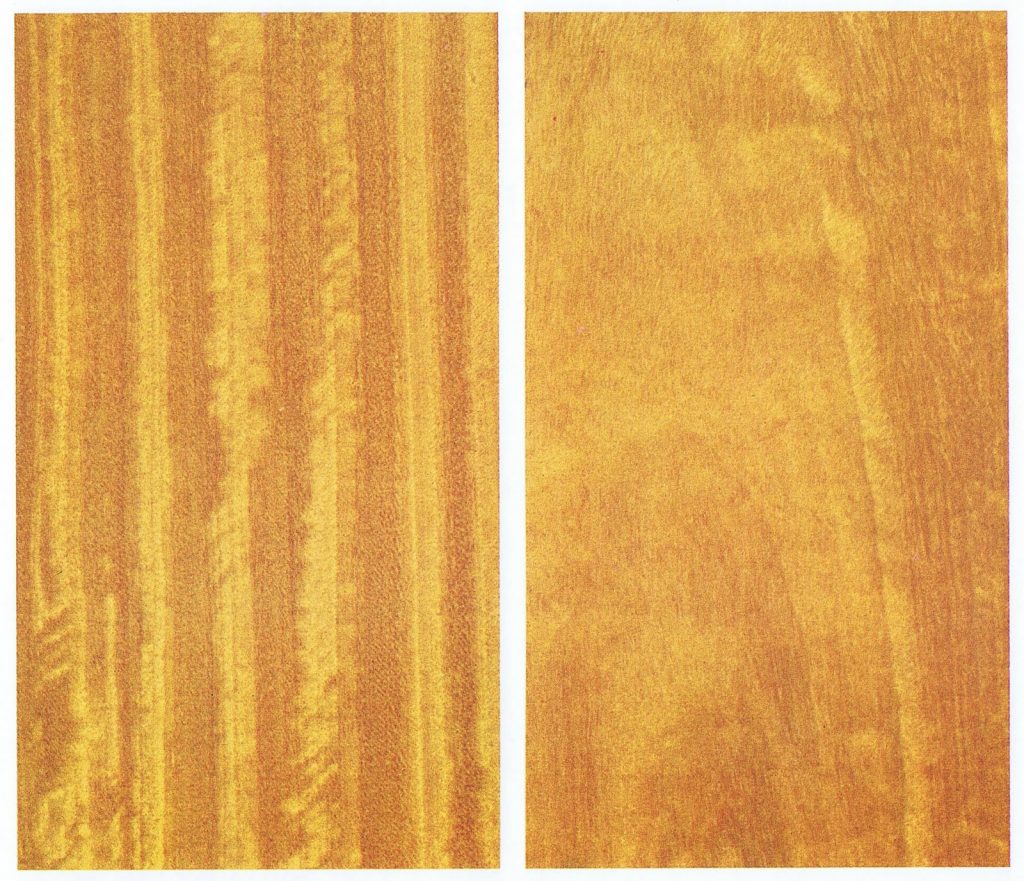 Le movingui, également connu sous le nom d’iroko jaune, est un bois africain originaire du Gabon, du Cameroun et du Ghana. Il est apprécié pour sa couleur vive, qui va du jaune-citron à l’orangé-brun clair après l’exposition à la lumière. Son grain est généralement droit ou légèrement entrelacé, mais il est surtout connu pour présenter souvent des veines ondulées ou un motif flammé (moiré) qui lui confère un éclat chatoyant. C’est un bois moyennement lourd et très durable.