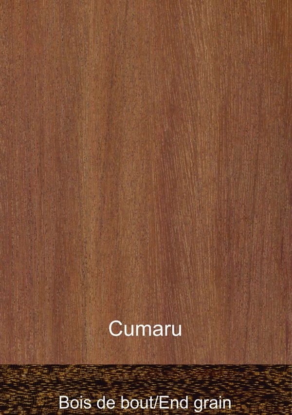 Le cumaru, souvent appelé teck brésilien, est un bois dur originaire des régions d’Amérique du Sud, notamment du Brésil, de Colombie et du Pérou. Il est très réputé pour sa dureté et sa durabilité comparables à celles de l’ipé. Sa couleur varie du brun jaunâtre au brun rougeâtre, souvent avec des variations subtiles dans la coloration. Le cumaru possède un grain entrelacé et une texture fine à moyenne, et il est connu pour son parfum distinctif, semblable à la vanille ou à la cannelle, émanant des coumarines qu’il contient.