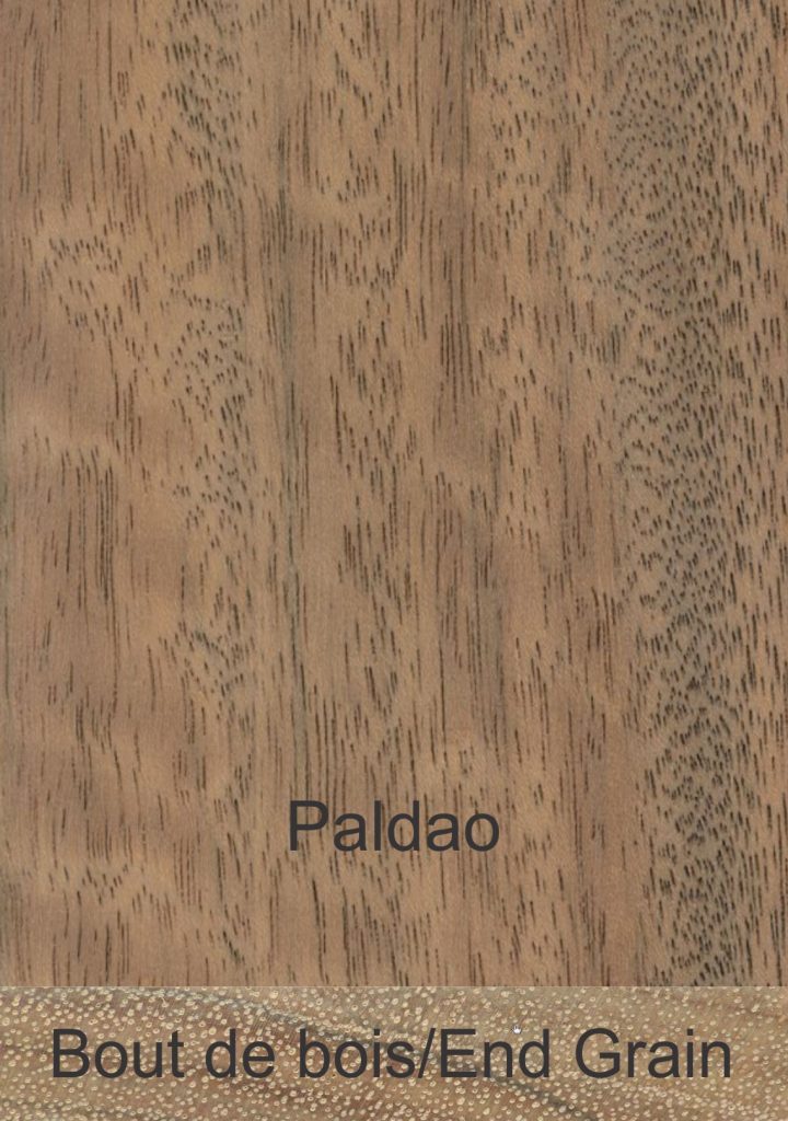 Le paldao, aussi appelé le noyer des Philippines, est un bois exotique et très décoratif originaire d’Asie du Sud-Est. Il est très recherché pour son grain spectaculaire, souvent caractérisé par des motifs ondulés, des tourbillons et des veines foncées qui contrastent avec son fond brun-doré clair. Le paldao est un bois durable et stable qui se travaille bien.