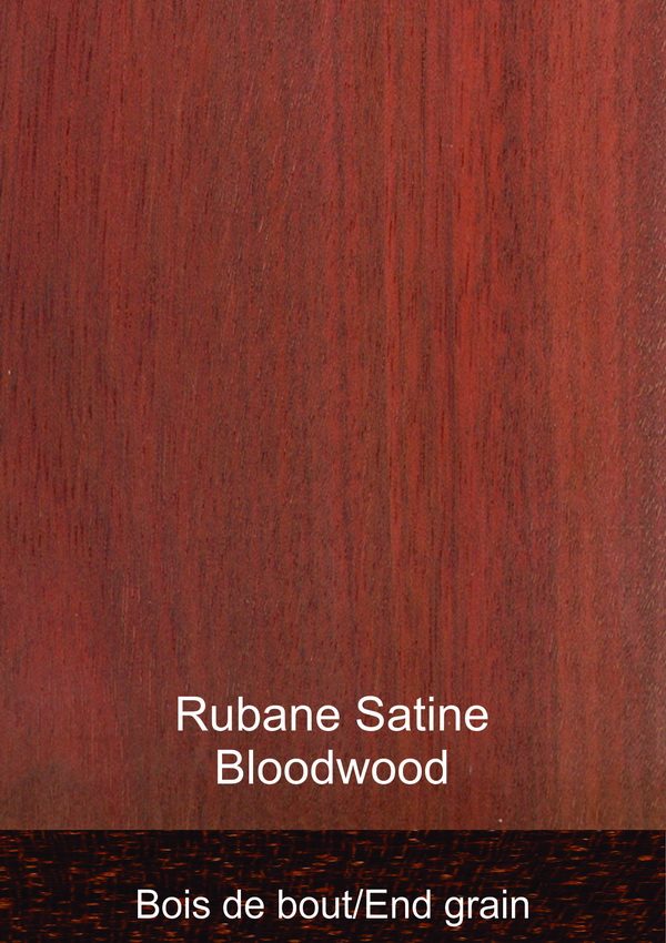 Le satiné rubané, aussi appelé bois de sang (ou Bloodwood), est un bois exotique qui pousse en Amérique du Sud. Il est réputé pour sa couleur rouge écarlate et son éclat naturel. Le terme « rubané » fait référence à un effet de chatoyance où des bandes de lumière et d’ombre semblent glisser sur la surface, créant un motif visuel saisissant qui en fait un bois d’exception. Il est très dur, dense et a un grain fin.